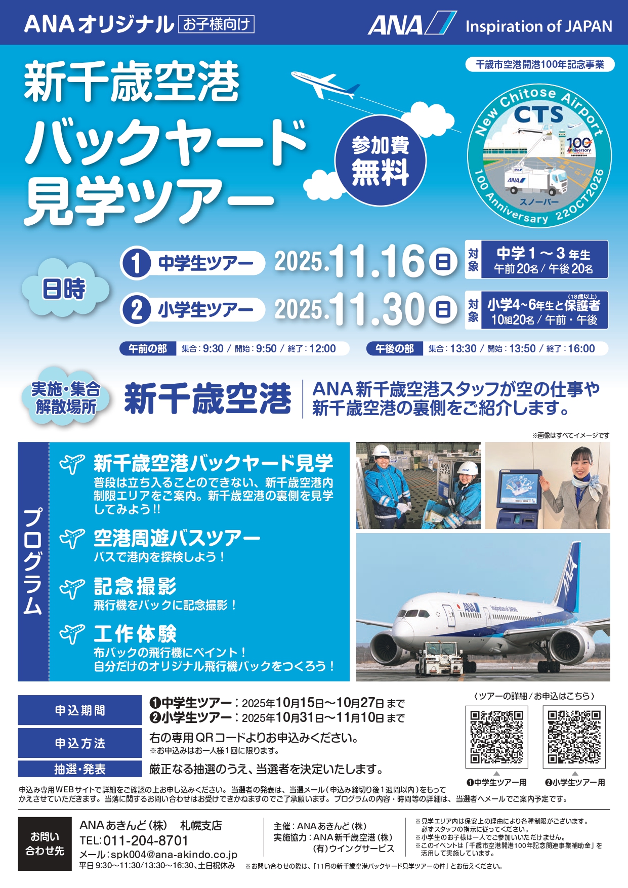 2026年の空港開港100年を記念し、ANAあきんど㈱様による「新千歳空港バックヤード見学ツアー」が下記のとおり開催されます。