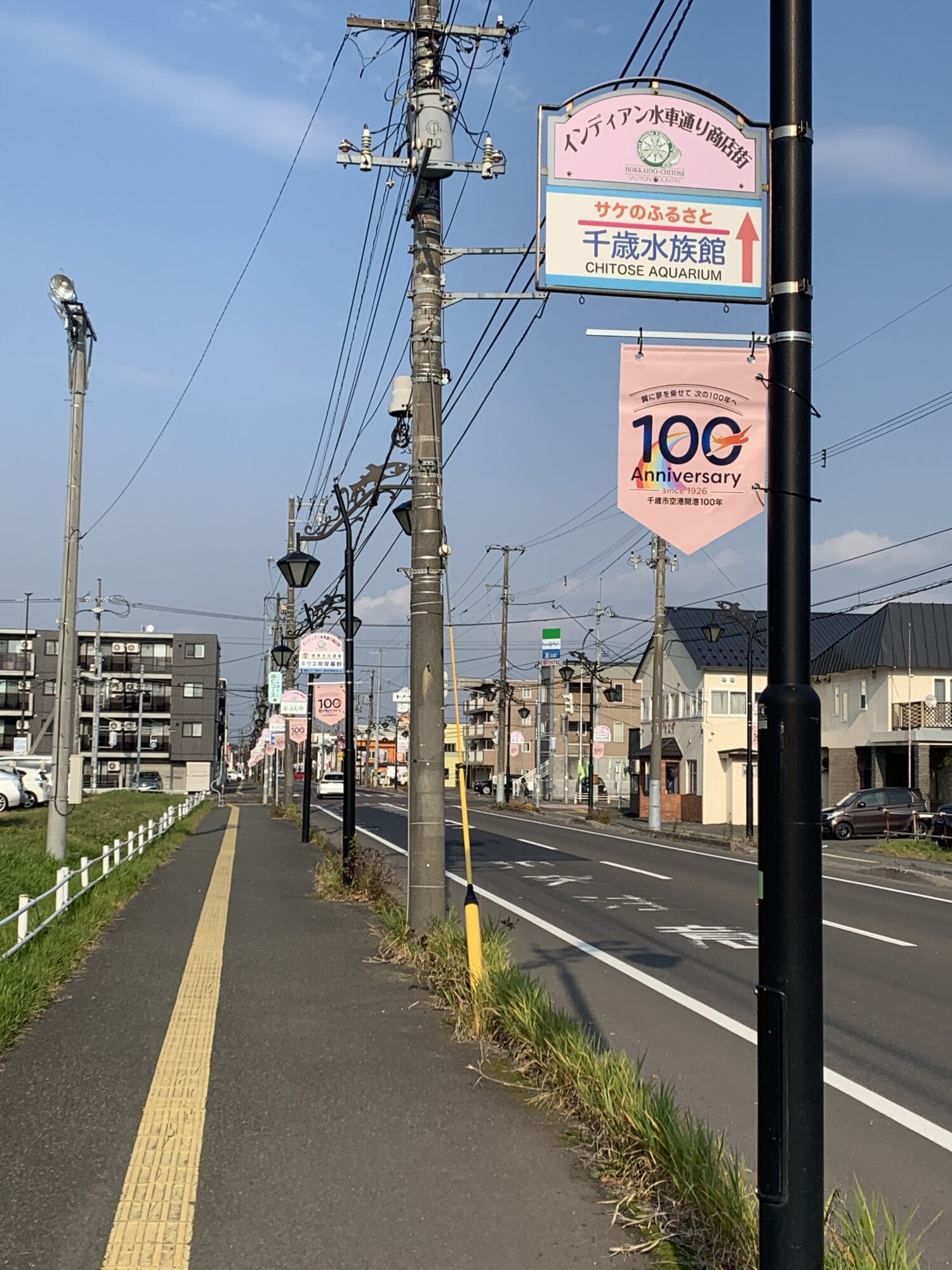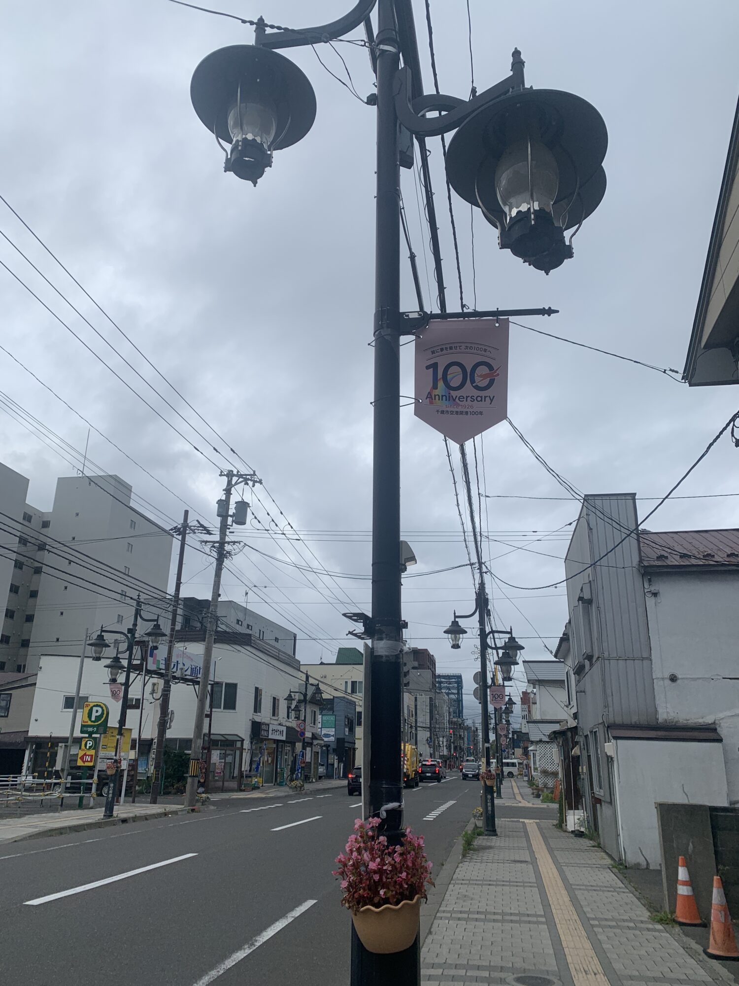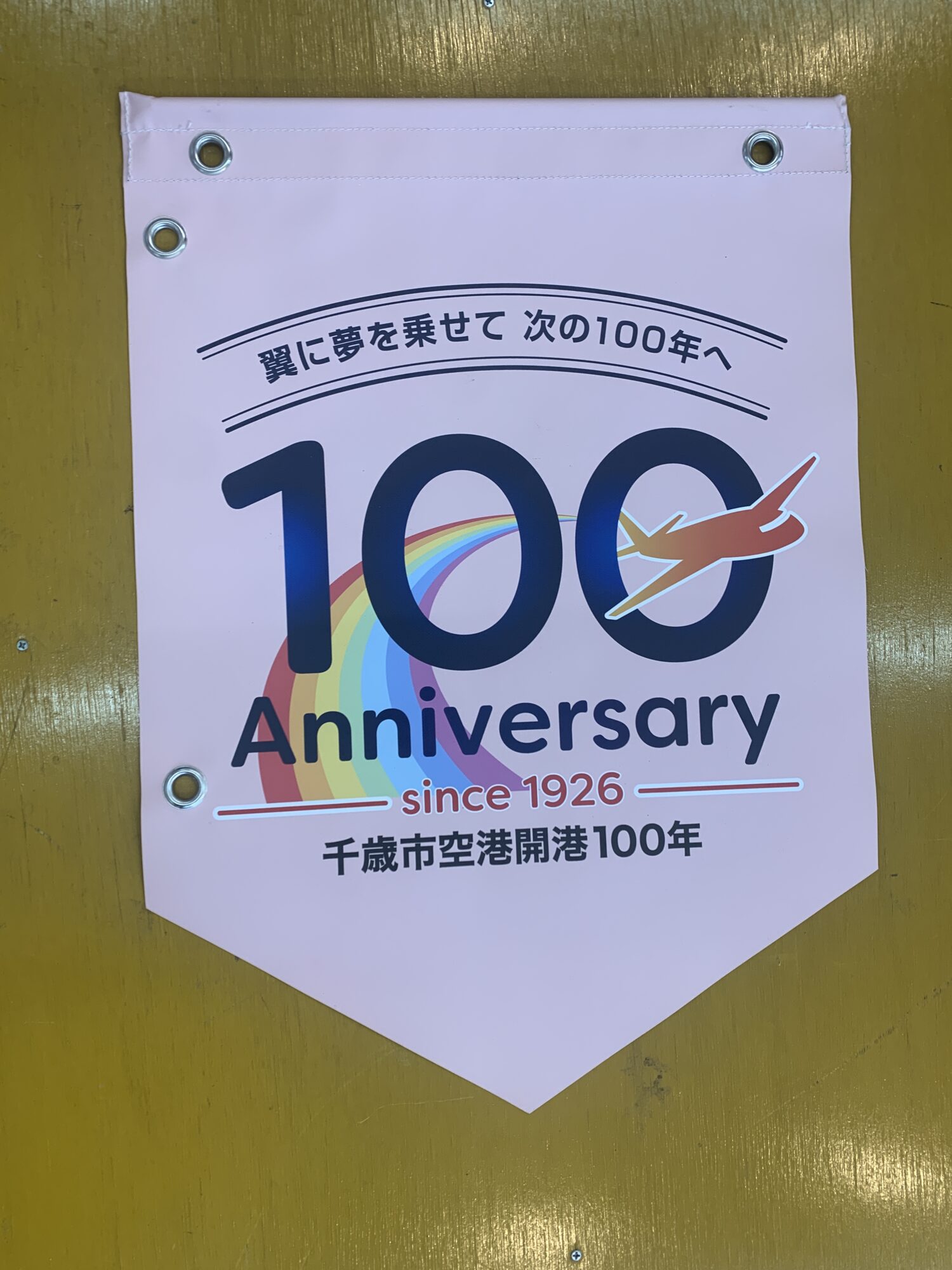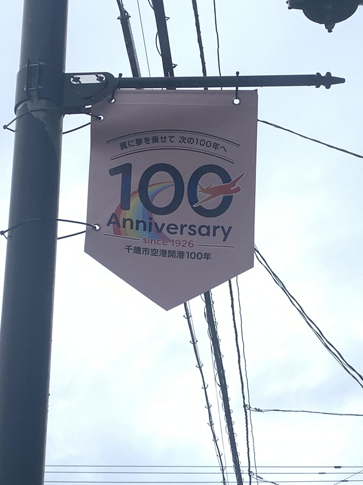 来年に迎える千歳市空港開港100年を記念し、千歳市商店街振興組合連合会様のご協力により市内の商店街の街路灯に100年記念ロゴデザインのフラッグ装飾を行いました。