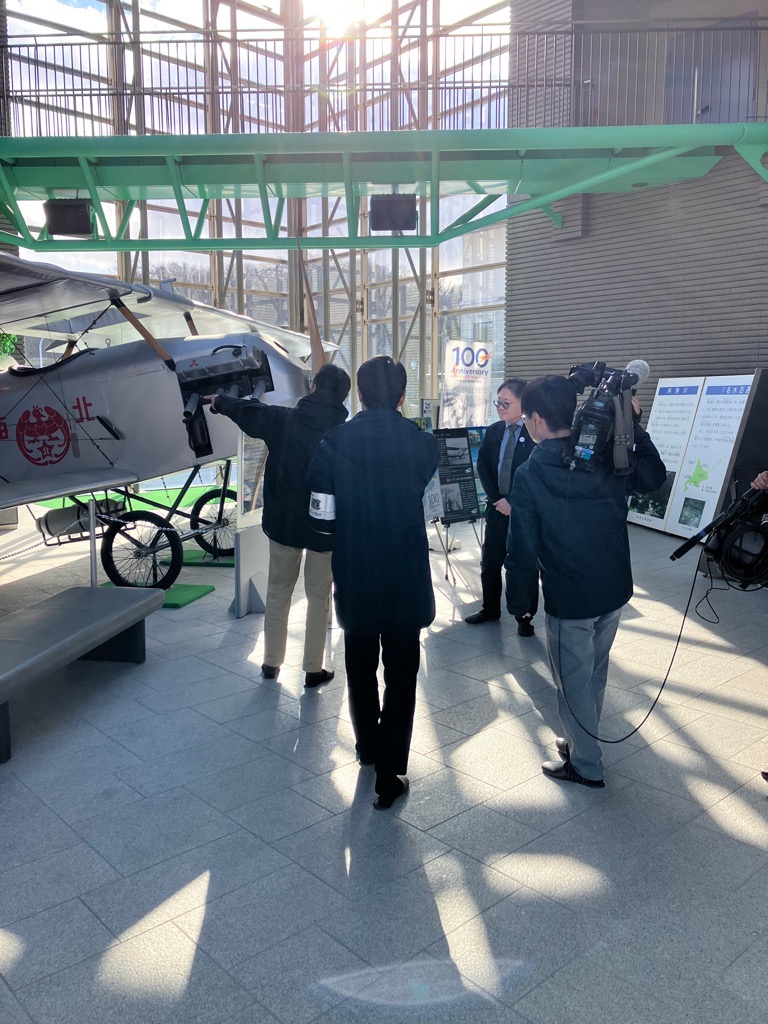 宮永アナウンサーにお越しいただき、100年前の千歳村民の「飛行機が見たい!」という熱い思いから千歳の空の歴史が始まったこと、初めて着陸した「北海」第一号などについてお話しさせていただきました。