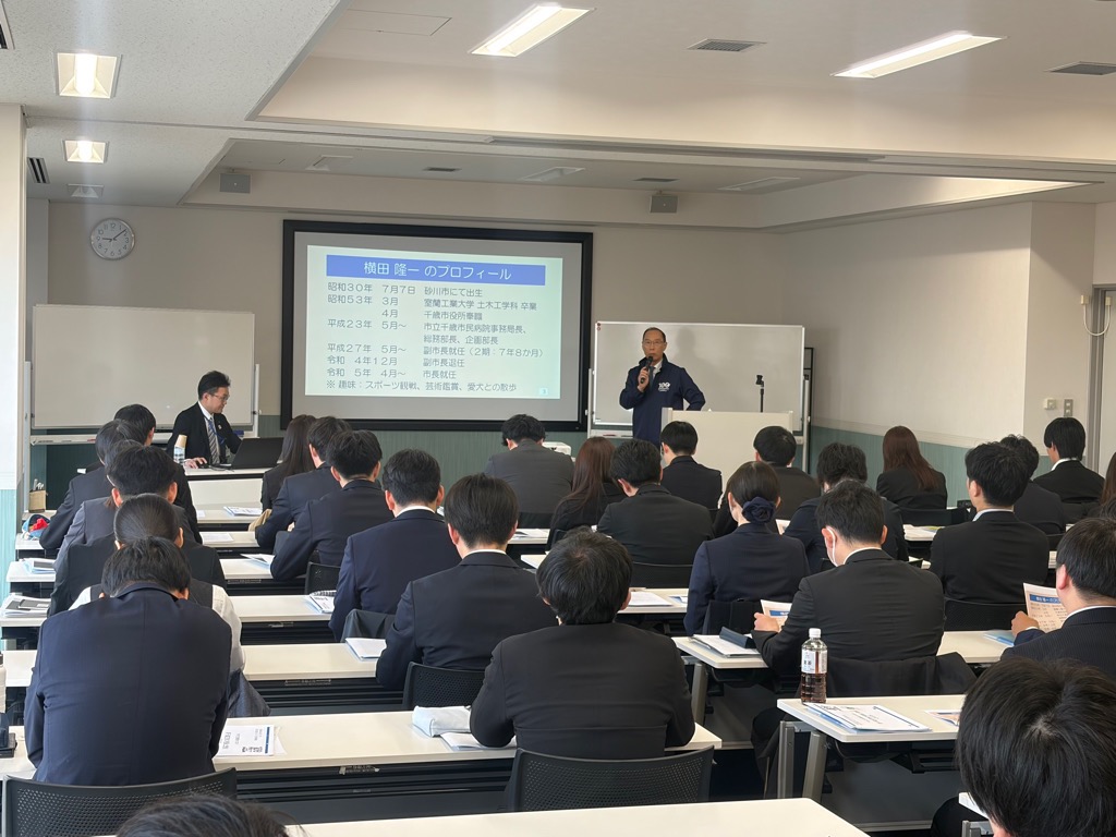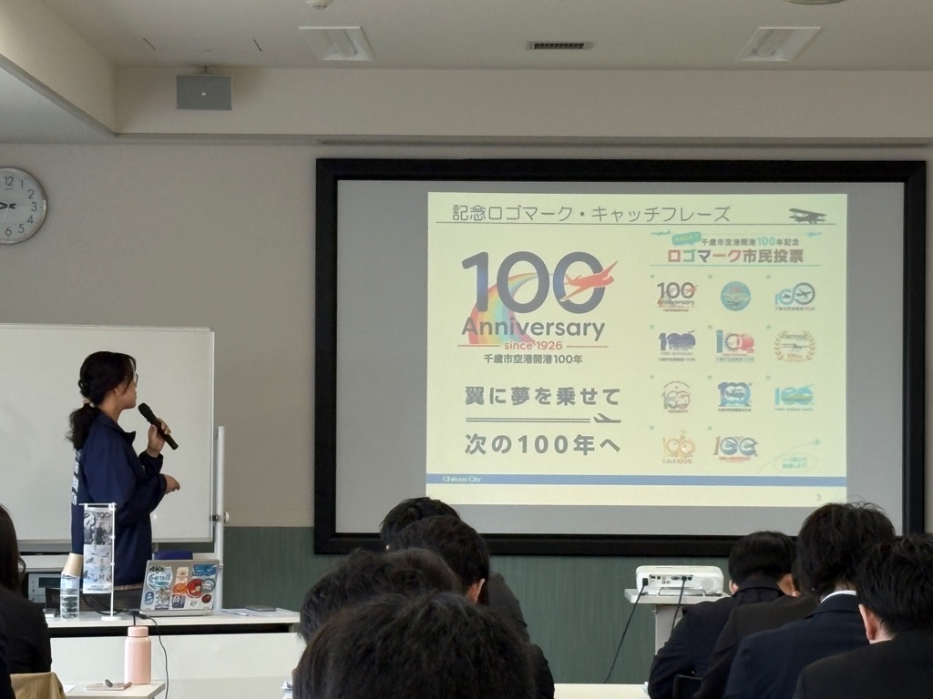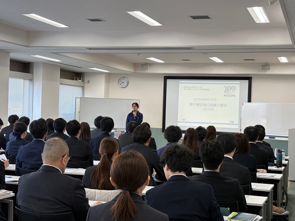 千歳アルカディア・プラザで開催された市内の企業と市の合同による新人研修で空港の歴史などについてお話しさせていただきました。また、事務局の講座の前には市長による講話が行われ、この研修を通じて、新人の皆様には空港開港100年の歴史を知っていただき、千歳市で自分たちがどのような役割を果たせるかを学んでいただけたことと思います。新人の皆様が、次の100年に向けて空港とともに成長していくことを楽しみにしています。
